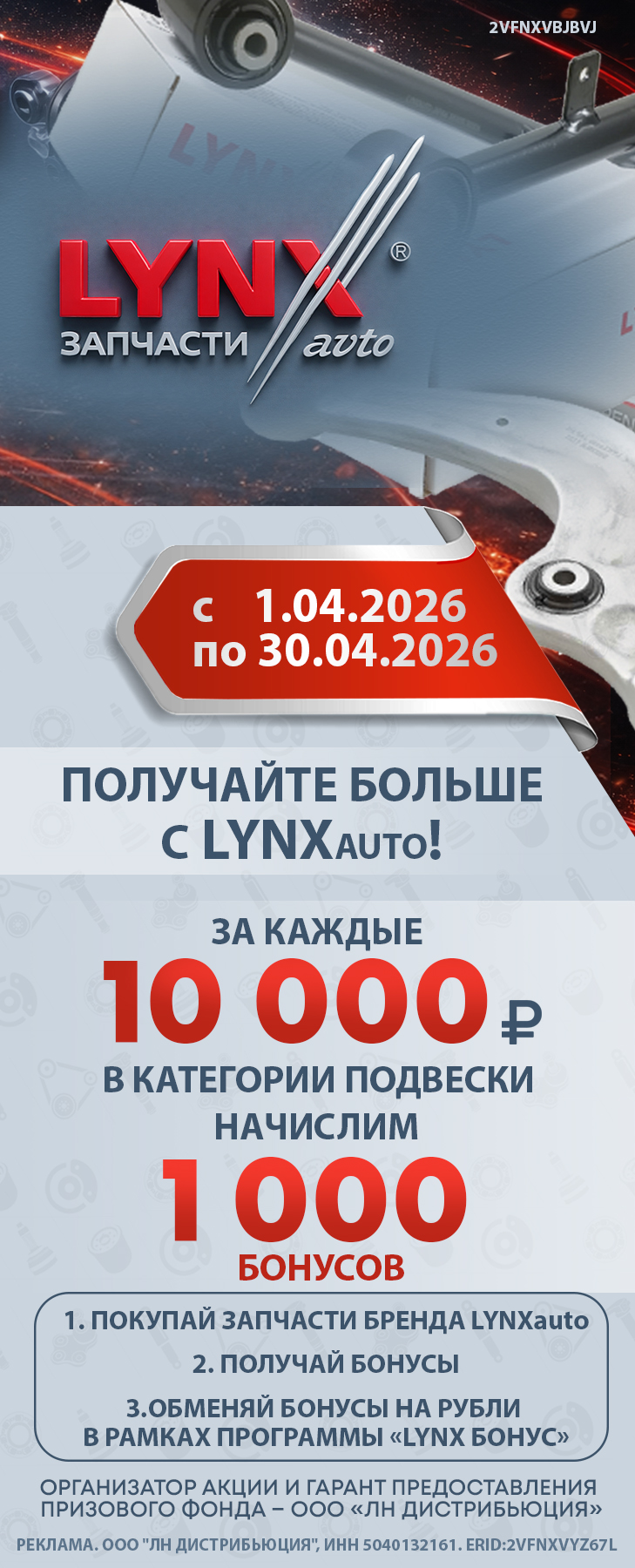 01 - 30.04.2026 Акция ПЛ ЛИНКСБОНУС (LYNXбонус) "Получи бонус 1 000 ₽ за каждые 10 000 ₽ на продукции ЛИНКСАВТО (LYNXauto) в категории ПОДВЕСКА"