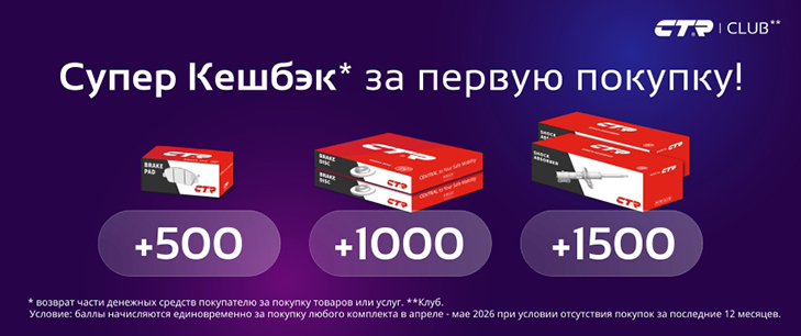 Компания СТР (CTR) запускает специальную акцию в программе лояльности СТР КЛУБ (CTR CLUB). С апреля по май 2026 года участники Клуба, которые ранее не приобретали амортизаторы, тормозные диски и тормозные колодки, получат возможность получить повышенный кешбэк за первые покупки в этих категориях.